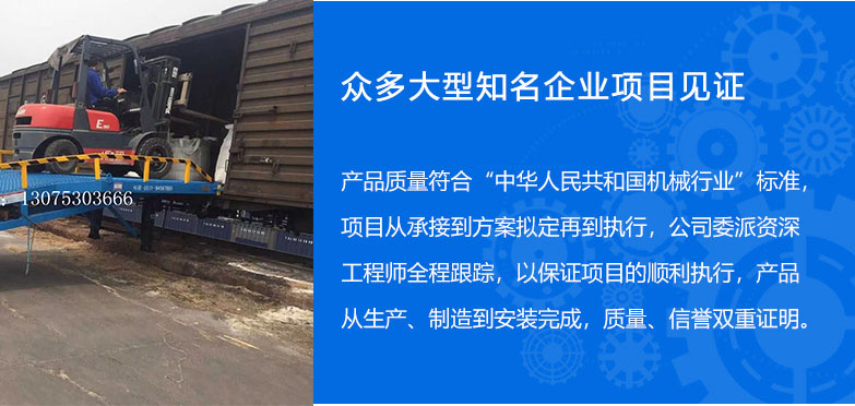 >> 13年的登車橋設(shè)備制造經(jīng)驗 集設(shè)計、研發(fā)、生產(chǎn)和銷售于一體的制造型企業(yè),專業(yè)制造液壓登車橋,移動式登 車橋和高空作業(yè)平臺,經(jīng)驗豐富,擁有強大的成產(chǎn)技術(shù)和完善的管理模式。 >> 引進國際先進施工工藝 配備整套專業(yè)自動化生成設(shè)備,引進國外先進技術(shù), 定期培訓(xùn),確保設(shè)備的高品質(zhì)。 產(chǎn)品具有設(shè)計新穎、結(jié)構(gòu)合理、升降平穩(wěn)、載重安全、操作簡單、維護方便等優(yōu)點。